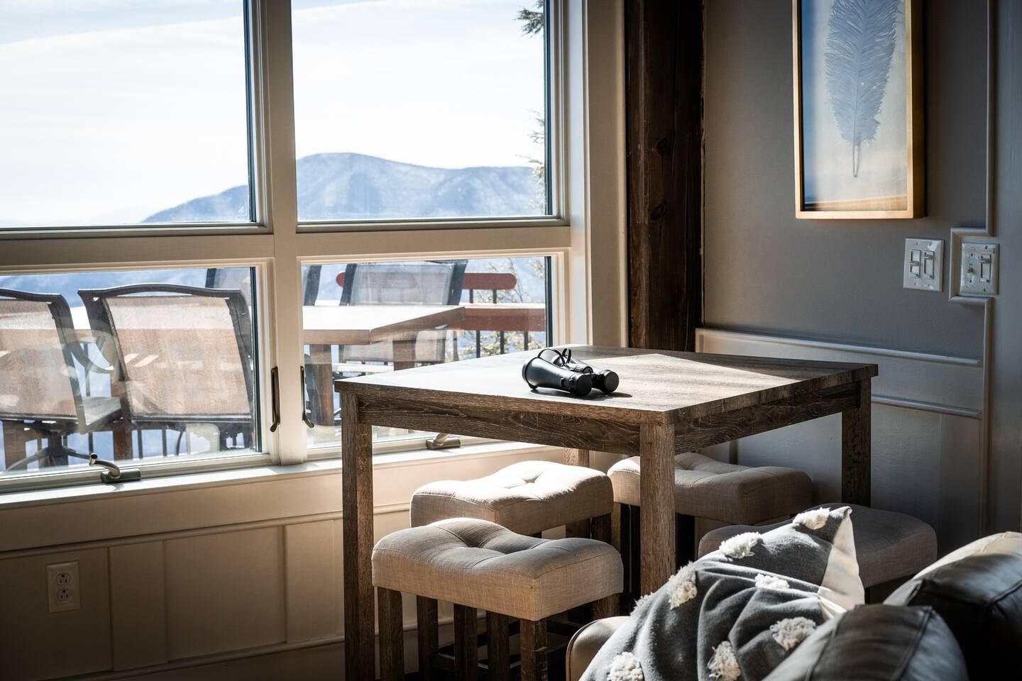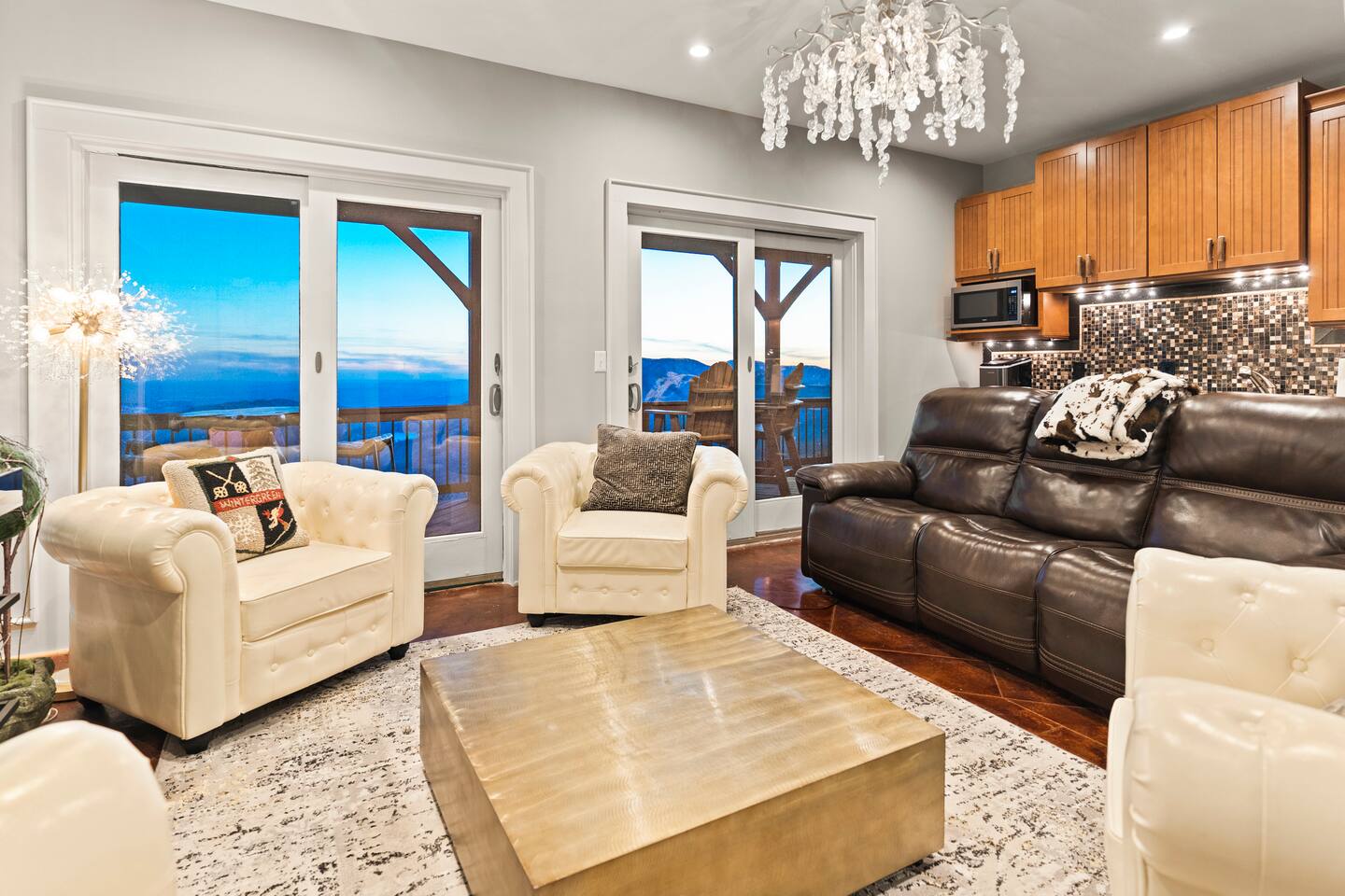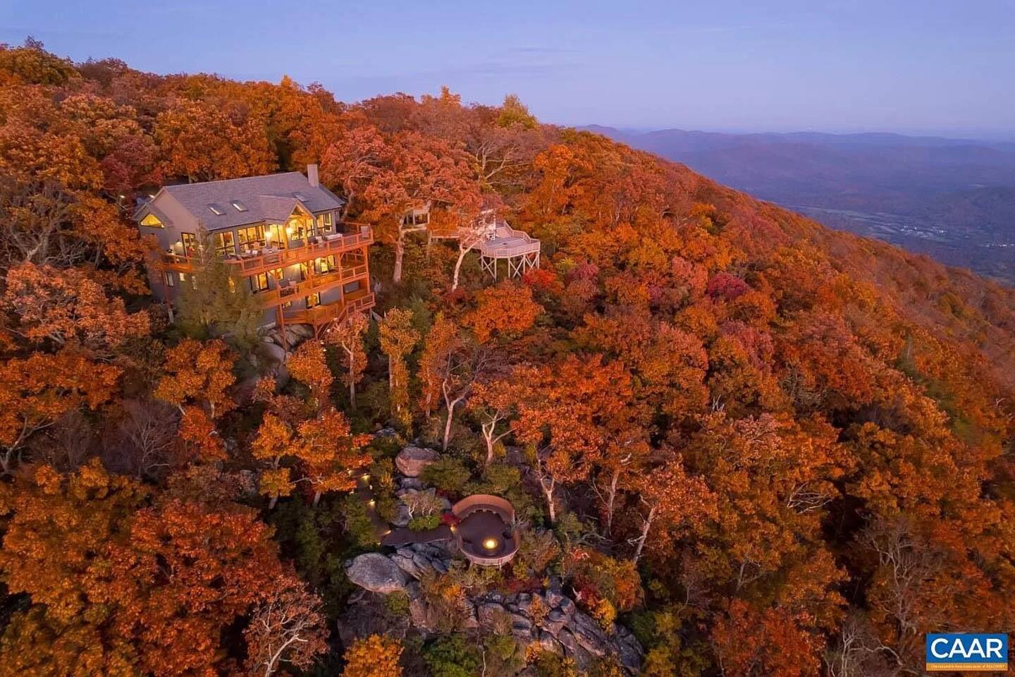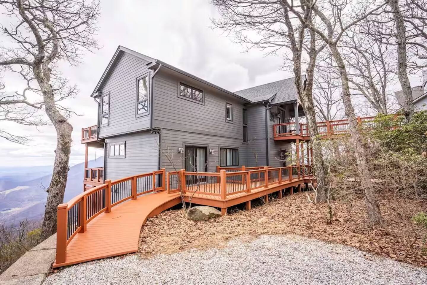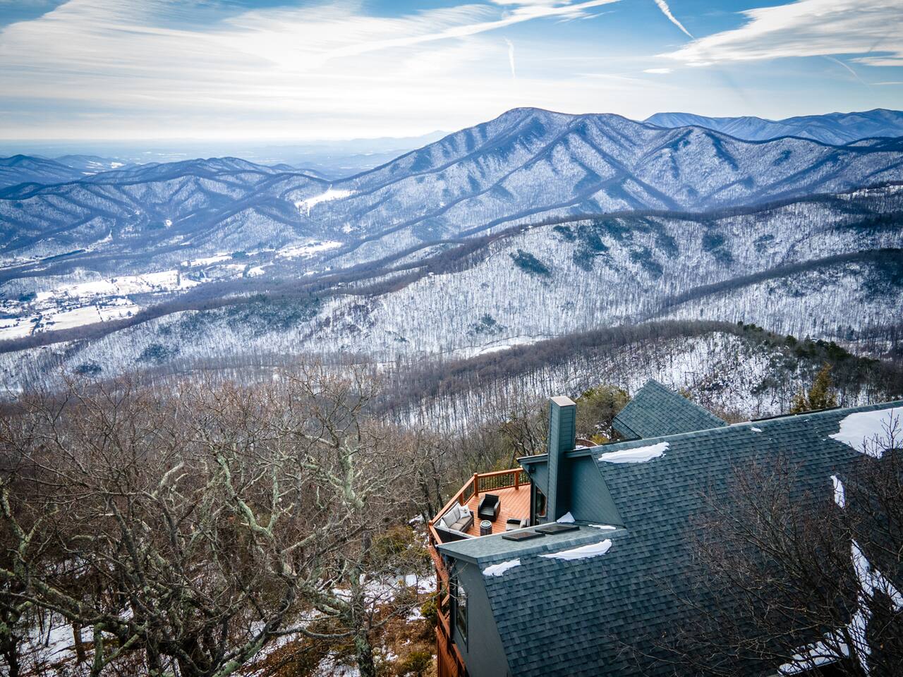 The chalet is less than 1 mile to the slopes and a few minutes’ drive to all the dining and entertainment at Wintergreen. Just two doors down is Blackrock park, which boasts a fantastic hiking trail that goes right by our backyard. If you’re willing to venture a bit further, some of the best hiking trails in the state are off the Blue Ridge Parkway (15 minutes from the cabin), two sandy-beach-entrance lakes plus a community pool for swimming, and over dozen wineries, breweries, and distilleries within a 30 minute drive. The home layout is as follows: Upper level: (Note: main entrance enters this level with zero steps from the flat upper driveway) - Grand entrance foyer - Primary living room with working propane fireplace and big screen TV - Dining area for 10, plus an addition table that seats 4, plus room for 4 more at the kitchen bar - Additional couch seating area to enjoy conversation and views. - Large, fully stocked kitchen with granite counters and island, stainless appliances, and gas range. Drip coffee and Keurig machines provided. - BR 1: Primary bedroom with king bed and upper deck access. Ensuite bathroom features jetted tub and steam shower - Half bath - Upper deck features multiple sitting areas, dining tables for 8 and 4, and a propane grill and fire table (propane provided for each) Middle level: (Note: lower driveway can access this level with zero steps) - Additional living room with big screen TV and wetbar with wine cooler, additional minifridge, and microwave - BR 2: King bed with ensuite bathroom - BR 3: King bed with ensuite bathroom - BR 4: 2 queen beds with ensuite bathroom - BR 5: King bed with dedicated work space. *Note: this bedroom does not have a bathroom, so bathroom options include using one of the other ensuite bathrooms on this level, or going downstairs to spa area bathroom - Full size washer and dryer - Middle level deck features multiple sitting areas and a table with seating for 4 - Heated floors throughout this level Lower level: - Game room with pool table, foosball table, arcade machine (which replaced the basketball game shown in photos), and TV - BR6: 2 queen beds - Spa area with indoor sauna and steam shower, built directly into the mountain with exposed boulder - Heated floors throughout this area - Lower level deck has 7 person hot tub with privacy fencing and amazing views - Lighted walkway down to the Eagle’s Nest sitting area with two custom-built curved benches and propane fire table