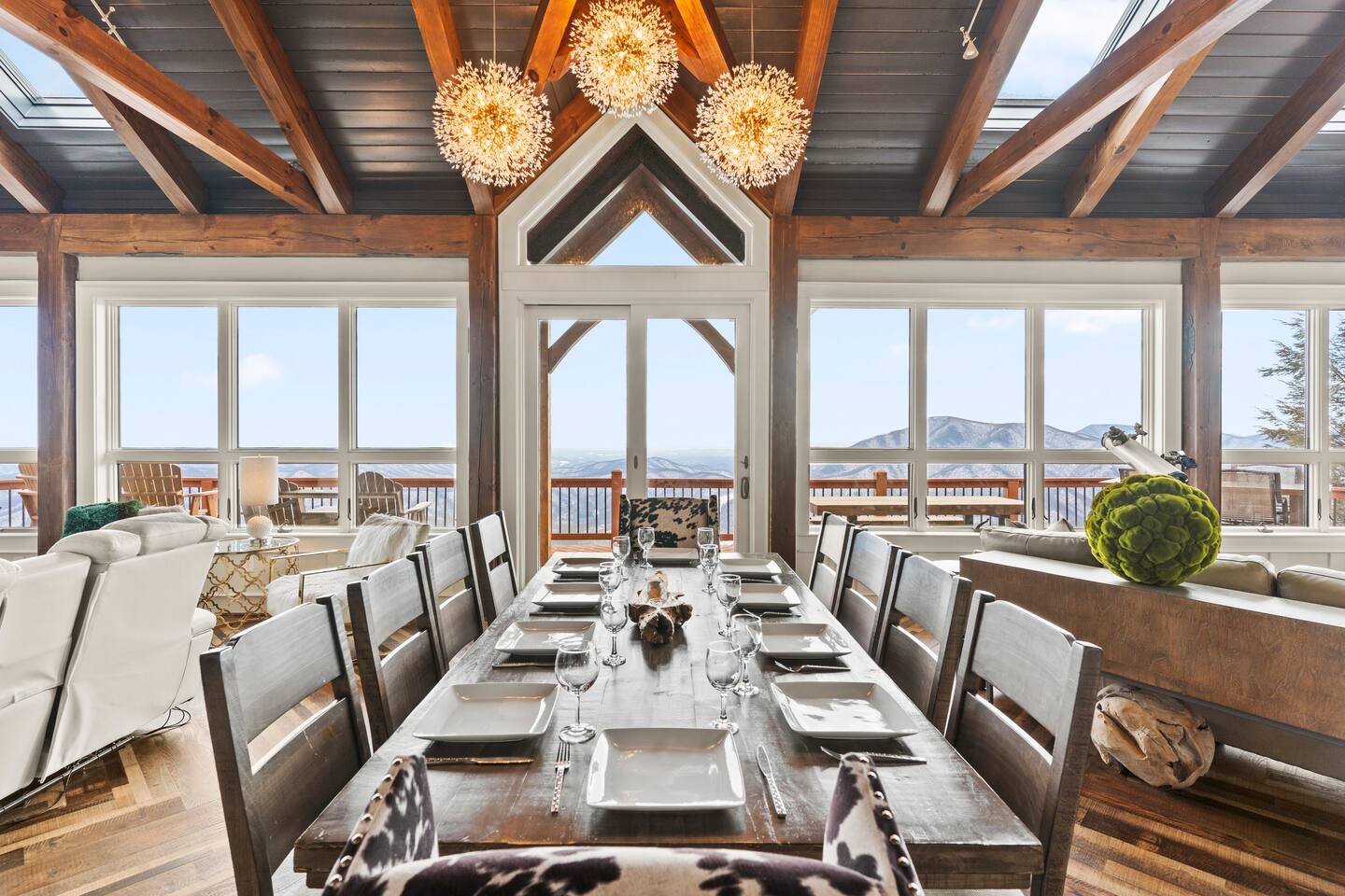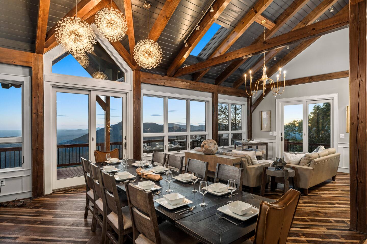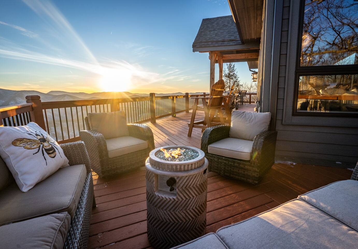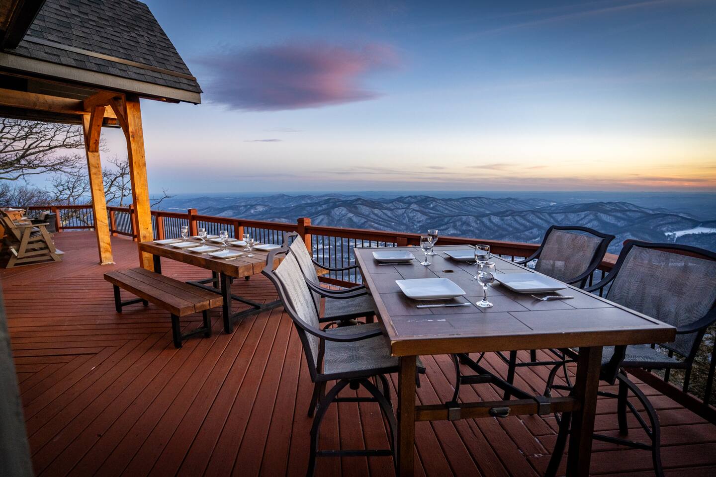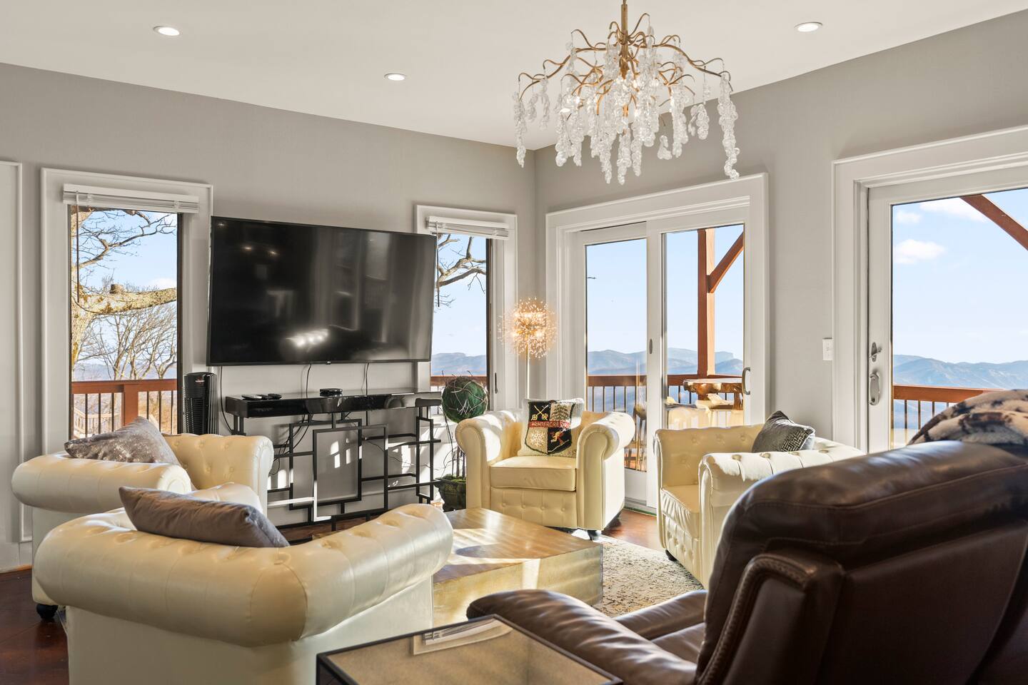 The chalet is less than 1 mile to the slopes and a few minutes’ drive to all the dining and entertainment at Wintergreen. Just two doors down is Blackrock park, which boasts a fantastic hiking trail that goes right by our backyard. If you’re willing to venture a bit further, some of the best hiking trails in the state are off the Blue Ridge Parkway (15 minutes from the cabin), two sandy-beach-entrance lakes plus a community pool for swimming, and over dozen wineries, breweries, and distilleries within a 30 minute drive. The home layout is as follows: Upper level: (Note: main entrance enters this level with zero steps from the flat upper driveway) - Grand entrance foyer - Primary living room with working propane fireplace and big screen TV - Dining area for 10, plus an addition table that seats 4, plus room for 4 more at the kitchen bar - Additional couch seating area to enjoy conversation and views. - Large, fully stocked kitchen with granite counters and island, stainless appliances, and gas range. Drip coffee and Keurig machines provided. - BR 1: Primary bedroom with king bed and upper deck access. Ensuite bathroom features jetted tub and steam shower - Half bath - Upper deck features multiple sitting areas, dining tables for 8 and 4, and a propane grill and fire table (propane provided for each) Middle level: (Note: lower driveway can access this level with zero steps) - Additional living room with big screen TV and wetbar with wine cooler, additional minifridge, and microwave - BR 2: King bed with ensuite bathroom - BR 3: King bed with ensuite bathroom - BR 4: 2 queen beds with ensuite bathroom - BR 5: King bed with dedicated work space. *Note: this bedroom does not have a bathroom, so bathroom options include using one of the other ensuite bathrooms on this level, or going downstairs to spa area bathroom - Full size washer and dryer - Middle level deck features multiple sitting areas and a table with seating for 4 - Heated floors throughout this level Lower level: - Game room with pool table, foosball table, arcade machine (which replaced the basketball game shown in photos), and TV - BR6: 2 queen beds - Spa area with indoor sauna and steam shower, built directly into the mountain with exposed boulder - Heated floors throughout this area - Lower level deck has 7 person hot tub with privacy fencing and amazing views - Lighted walkway down to the Eagle’s Nest sitting area with two custom-built curved benches and propane fire table