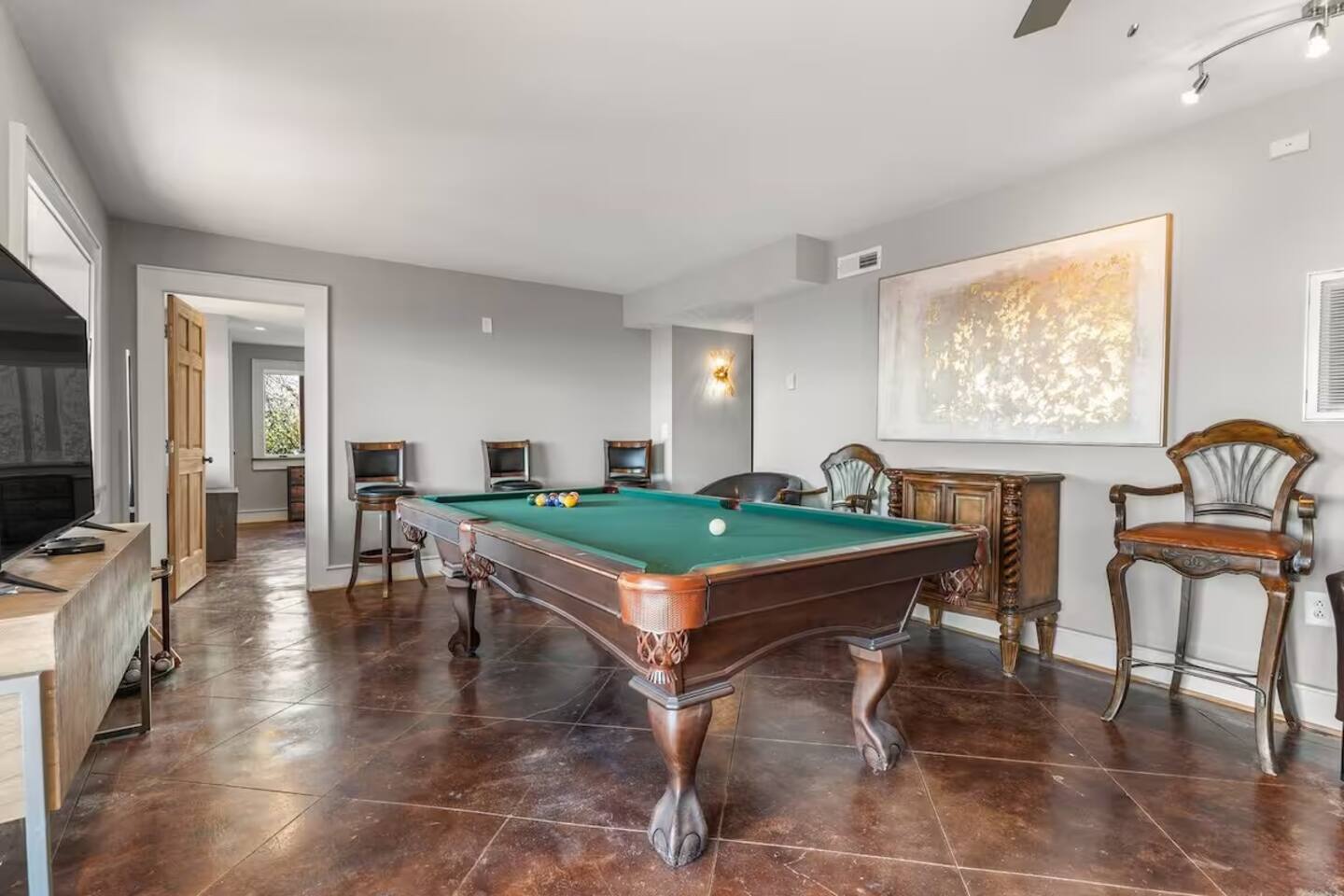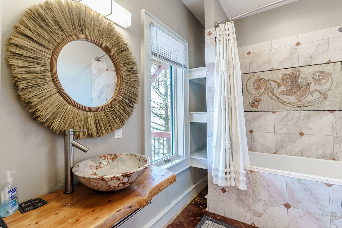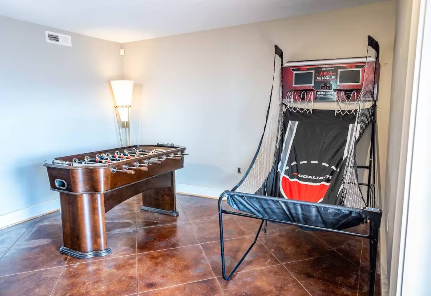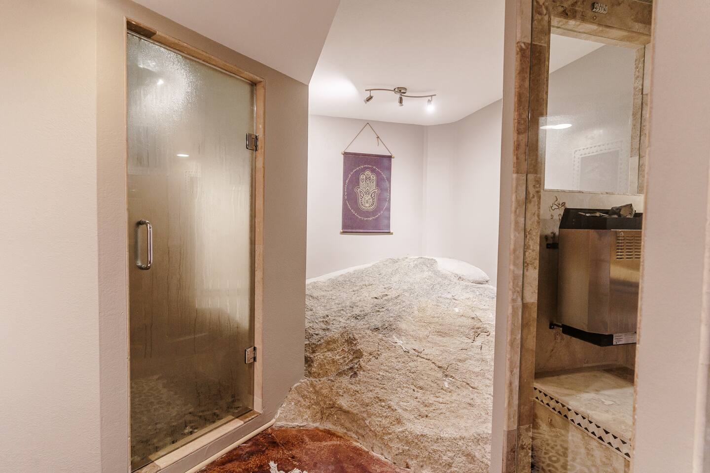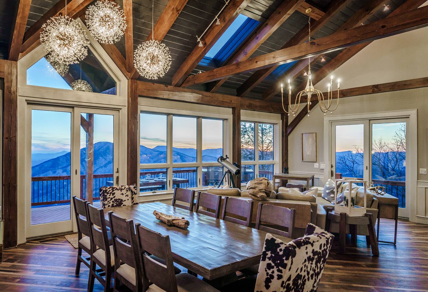 The chalet is less than 1 mile to the slopes and a few minutes’ drive to all the dining and entertainment at Wintergreen. Just two doors down is Blackrock park, which boasts a fantastic hiking trail that goes right by our backyard. If you’re willing to venture a bit further, some of the best hiking trails in the state are off the Blue Ridge Parkway (15 minutes from the cabin), two sandy-beach-entrance lakes plus a community pool for swimming, and over dozen wineries, breweries, and distilleries within a 30 minute drive. The home layout is as follows: Upper level: (Note: main entrance enters this level with zero steps from the flat upper driveway) - Grand entrance foyer - Primary living room with working propane fireplace and big screen TV - Dining area for 10, plus an addition table that seats 4, plus room for 4 more at the kitchen bar - Additional couch seating area to enjoy conversation and views. - Large, fully stocked kitchen with granite counters and island, stainless appliances, and gas range. Drip coffee and Keurig machines provided. - BR 1: Primary bedroom with king bed and upper deck access. Ensuite bathroom features jetted tub and steam shower - Half bath - Upper deck features multiple sitting areas, dining tables for 8 and 4, and a propane grill and fire table (propane provided for each) Middle level: (Note: lower driveway can access this level with zero steps) - Additional living room with big screen TV and wetbar with wine cooler, additional minifridge, and microwave - BR 2: King bed with ensuite bathroom - BR 3: King bed with ensuite bathroom - BR 4: 2 queen beds with ensuite bathroom - BR 5: King bed with dedicated work space. *Note: this bedroom does not have a bathroom, so bathroom options include using one of the other ensuite bathrooms on this level, or going downstairs to spa area bathroom - Full size washer and dryer - Middle level deck features multiple sitting areas and a table with seating for 4 - Heated floors throughout this level Lower level: - Game room with pool table, foosball table, arcade machine (which replaced the basketball game shown in photos), and TV - BR6: 2 queen beds - Spa area with indoor sauna and steam shower, built directly into the mountain with exposed boulder - Heated floors throughout this area - Lower level deck has 7 person hot tub with privacy fencing and amazing views - Lighted walkway down to the Eagle’s Nest sitting area with two custom-built curved benches and propane fire table