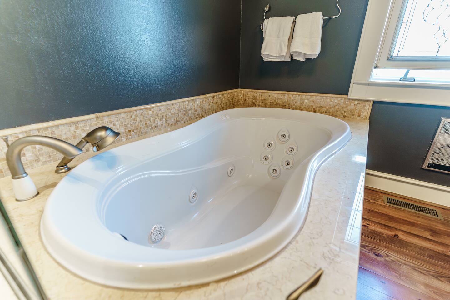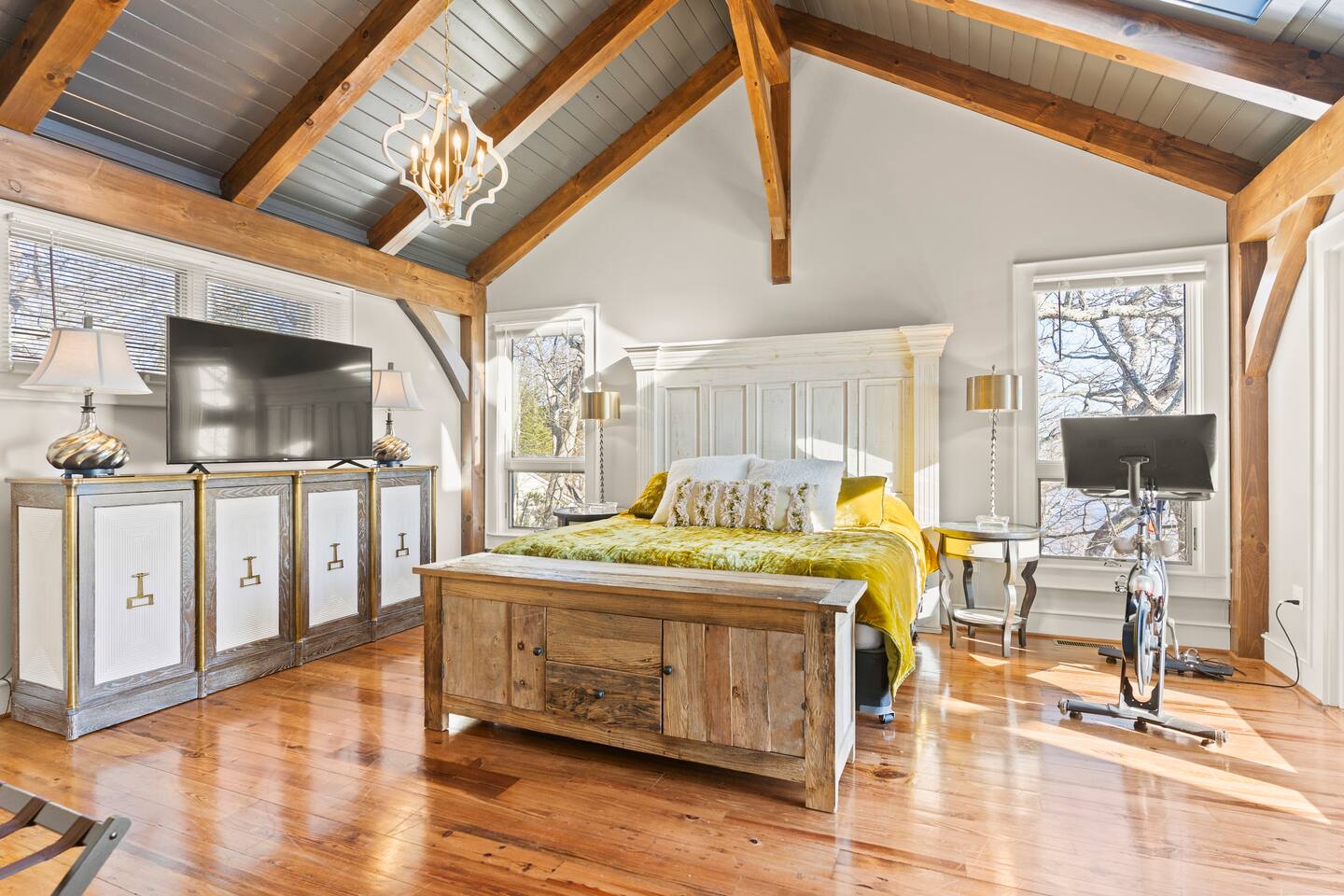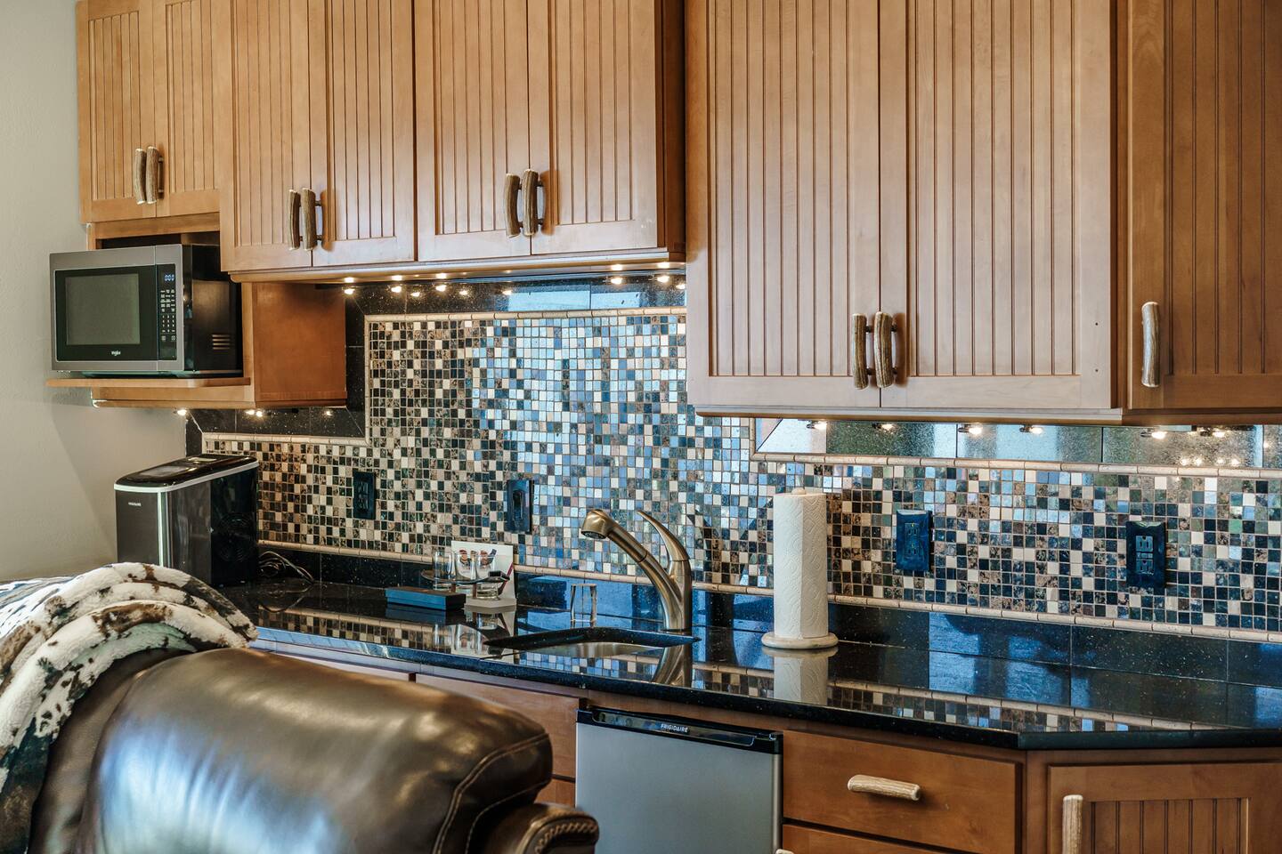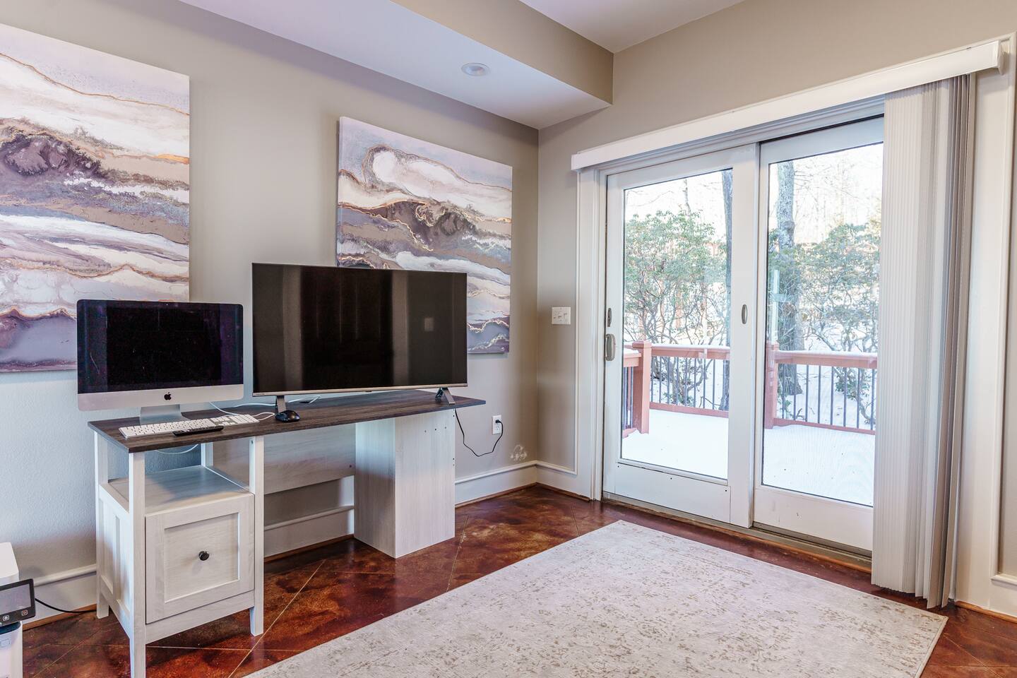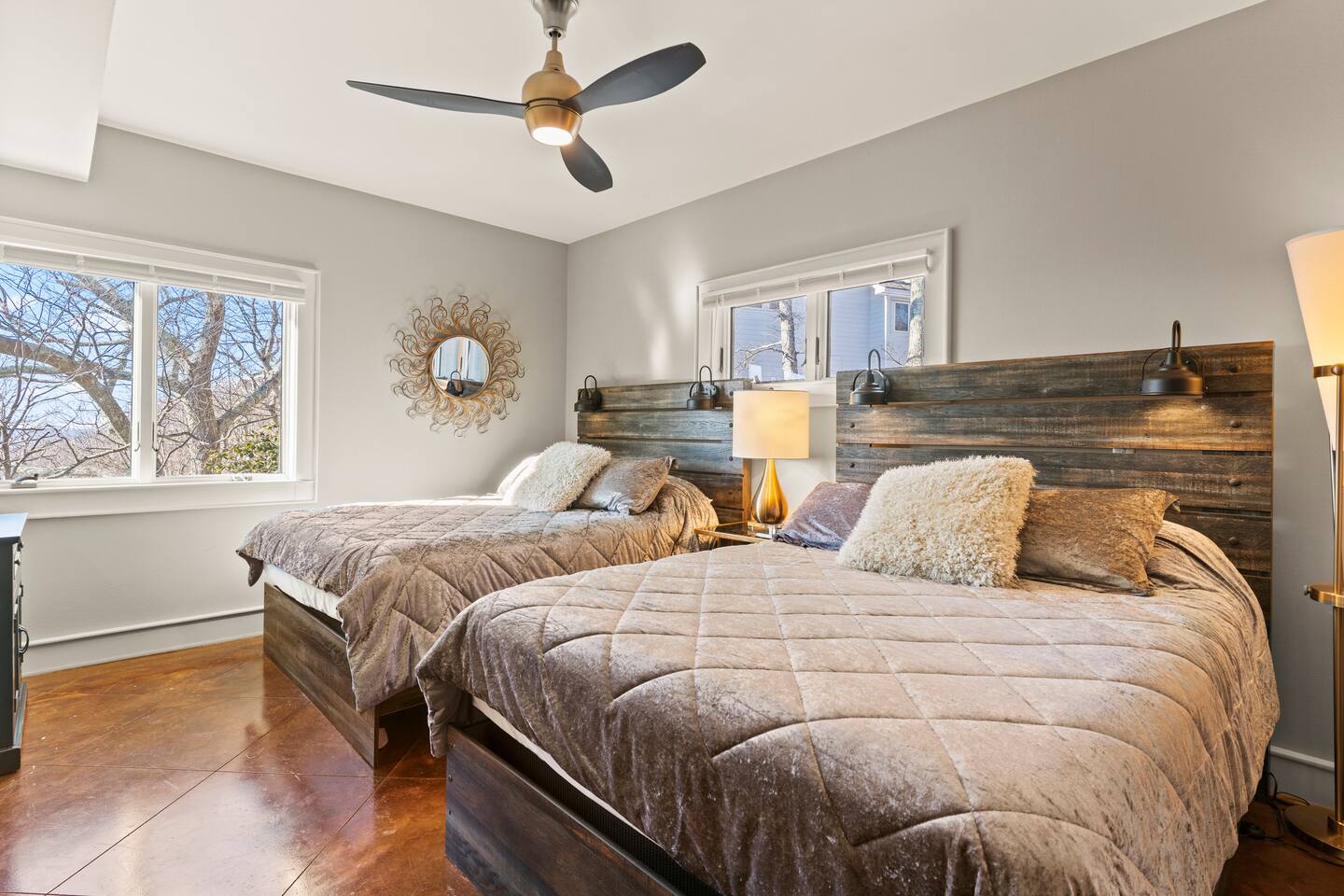 The chalet is less than 1 mile to the slopes and a few minutes’ drive to all the dining and entertainment at Wintergreen. Just two doors down is Blackrock park, which boasts a fantastic hiking trail that goes right by our backyard. If you’re willing to venture a bit further, some of the best hiking trails in the state are off the Blue Ridge Parkway (15 minutes from the cabin), two sandy-beach-entrance lakes plus a community pool for swimming, and over dozen wineries, breweries, and distilleries within a 30 minute drive. The home layout is as follows: Upper level: (Note: main entrance enters this level with zero steps from the flat upper driveway) - Grand entrance foyer - Primary living room with working propane fireplace and big screen TV - Dining area for 10, plus an addition table that seats 4, plus room for 4 more at the kitchen bar - Additional couch seating area to enjoy conversation and views. - Large, fully stocked kitchen with granite counters and island, stainless appliances, and gas range. Drip coffee and Keurig machines provided. - BR 1: Primary bedroom with king bed and upper deck access. Ensuite bathroom features jetted tub and steam shower - Half bath - Upper deck features multiple sitting areas, dining tables for 8 and 4, and a propane grill and fire table (propane provided for each) Middle level: (Note: lower driveway can access this level with zero steps) - Additional living room with big screen TV and wetbar with wine cooler, additional minifridge, and microwave - BR 2: King bed with ensuite bathroom - BR 3: King bed with ensuite bathroom - BR 4: 2 queen beds with ensuite bathroom - BR 5: King bed with dedicated work space. *Note: this bedroom does not have a bathroom, so bathroom options include using one of the other ensuite bathrooms on this level, or going downstairs to spa area bathroom - Full size washer and dryer - Middle level deck features multiple sitting areas and a table with seating for 4 - Heated floors throughout this level Lower level: - Game room with pool table, foosball table, arcade machine (which replaced the basketball game shown in photos), and TV - BR6: 2 queen beds - Spa area with indoor sauna and steam shower, built directly into the mountain with exposed boulder - Heated floors throughout this area - Lower level deck has 7 person hot tub with privacy fencing and amazing views - Lighted walkway down to the Eagle’s Nest sitting area with two custom-built curved benches and propane fire table