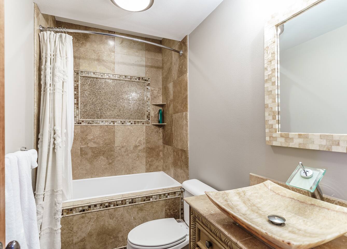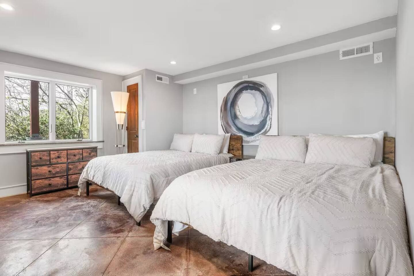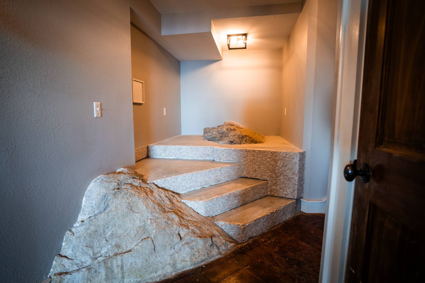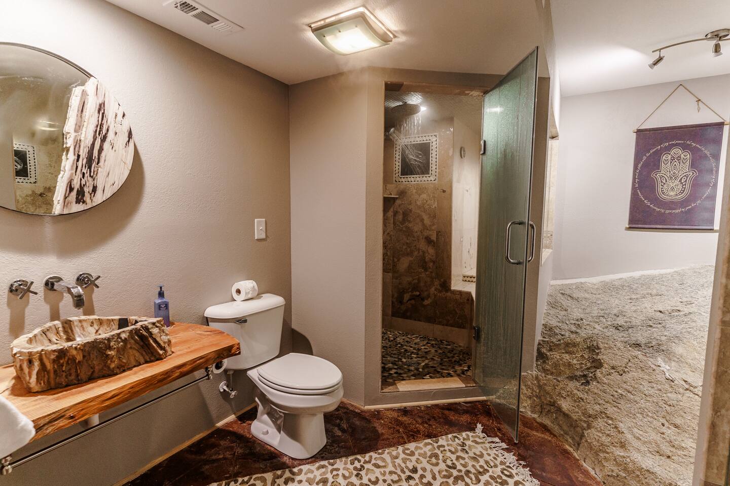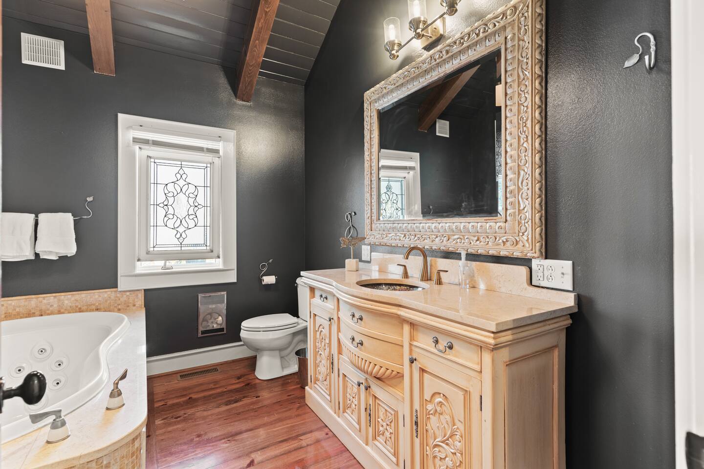 The chalet is less than 1 mile to the slopes and a few minutes’ drive to all the dining and entertainment at Wintergreen. Just two doors down is Blackrock park, which boasts a fantastic hiking trail that goes right by our backyard. If you’re willing to venture a bit further, some of the best hiking trails in the state are off the Blue Ridge Parkway (15 minutes from the cabin), two sandy-beach-entrance lakes plus a community pool for swimming, and over dozen wineries, breweries, and distilleries within a 30 minute drive. The home layout is as follows: Upper level: (Note: main entrance enters this level with zero steps from the flat upper driveway) - Grand entrance foyer - Primary living room with working propane fireplace and big screen TV - Dining area for 10, plus an addition table that seats 4, plus room for 4 more at the kitchen bar - Additional couch seating area to enjoy conversation and views. - Large, fully stocked kitchen with granite counters and island, stainless appliances, and gas range. Drip coffee and Keurig machines provided. - BR 1: Primary bedroom with king bed and upper deck access. Ensuite bathroom features jetted tub and steam shower - Half bath - Upper deck features multiple sitting areas, dining tables for 8 and 4, and a propane grill and fire table (propane provided for each) Middle level: (Note: lower driveway can access this level with zero steps) - Additional living room with big screen TV and wetbar with wine cooler, additional minifridge, and microwave - BR 2: King bed with ensuite bathroom - BR 3: King bed with ensuite bathroom - BR 4: 2 queen beds with ensuite bathroom - BR 5: King bed with dedicated work space. *Note: this bedroom does not have a bathroom, so bathroom options include using one of the other ensuite bathrooms on this level, or going downstairs to spa area bathroom - Full size washer and dryer - Middle level deck features multiple sitting areas and a table with seating for 4 - Heated floors throughout this level Lower level: - Game room with pool table, foosball table, arcade machine (which replaced the basketball game shown in photos), and TV - BR6: 2 queen beds - Spa area with indoor sauna and steam shower, built directly into the mountain with exposed boulder - Heated floors throughout this area - Lower level deck has 7 person hot tub with privacy fencing and amazing views - Lighted walkway down to the Eagle’s Nest sitting area with two custom-built curved benches and propane fire table